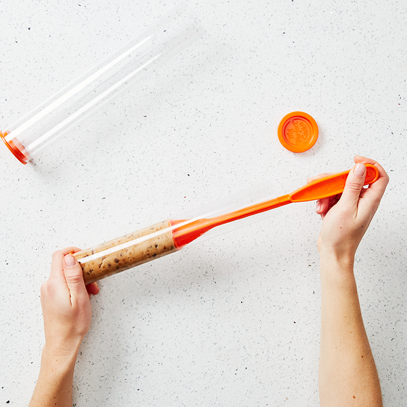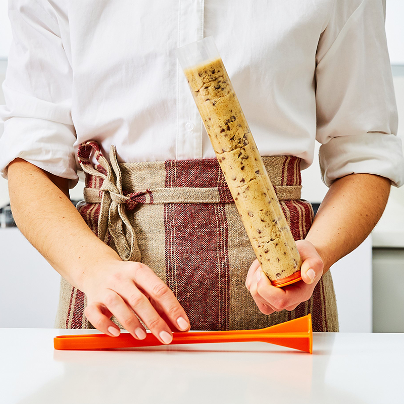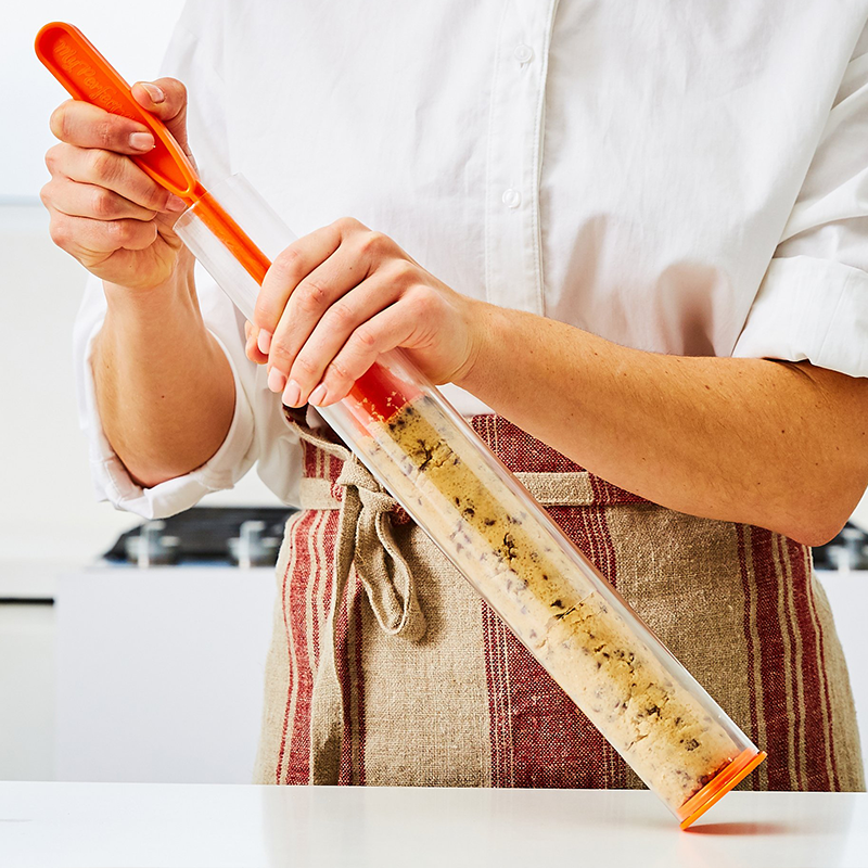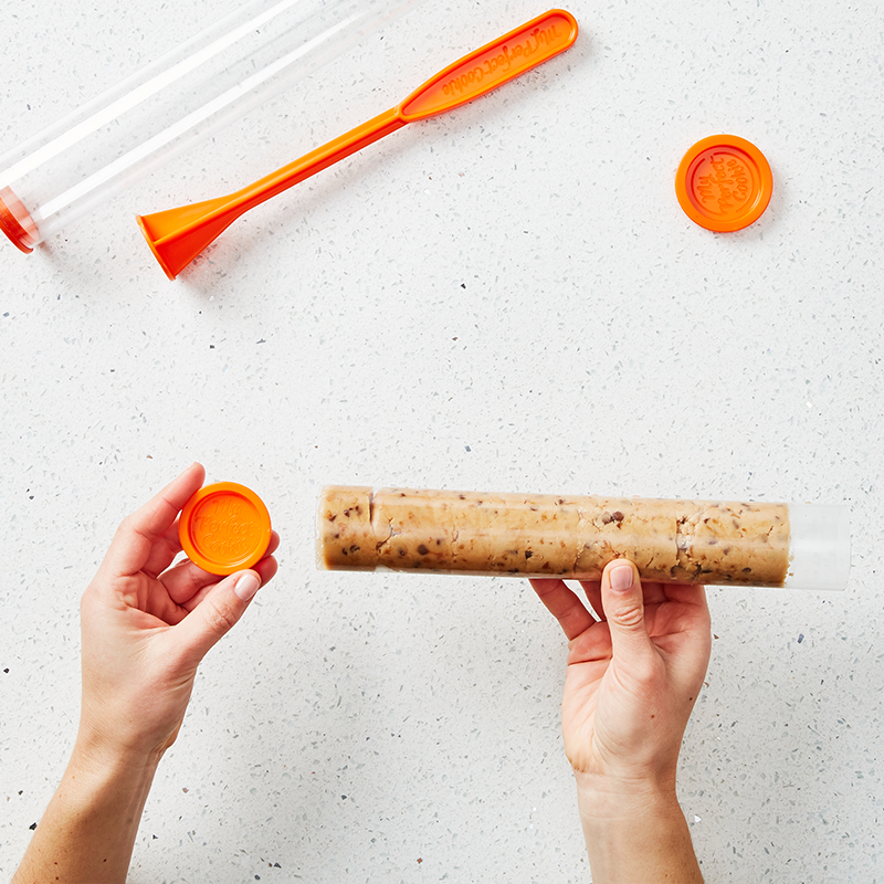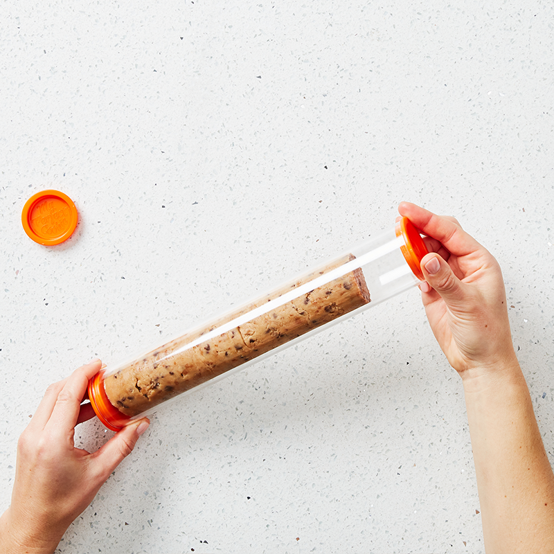 Once the entire cookie dough log is pushed into the storage tube, and the shaper tube is pulled out, secure the second cap. Your dough log is ready to be chilled.