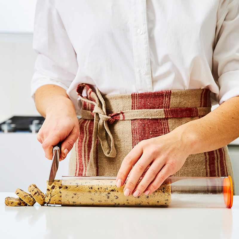 After the cookie dough log has chilled, tap the side of the tube against the edge of a table. This will release the dough from the side of the tube. Some doughs need to be left at room temperature for 15 minutes before tapping to release. Pull the log out and slice.